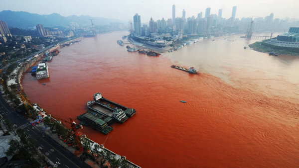 The red began appearing in the Yangtze, the longest and largest river in China and the third longest river in the world, yesterday near the city of Chongquing, where the Yangtze connects to the Jialin River.